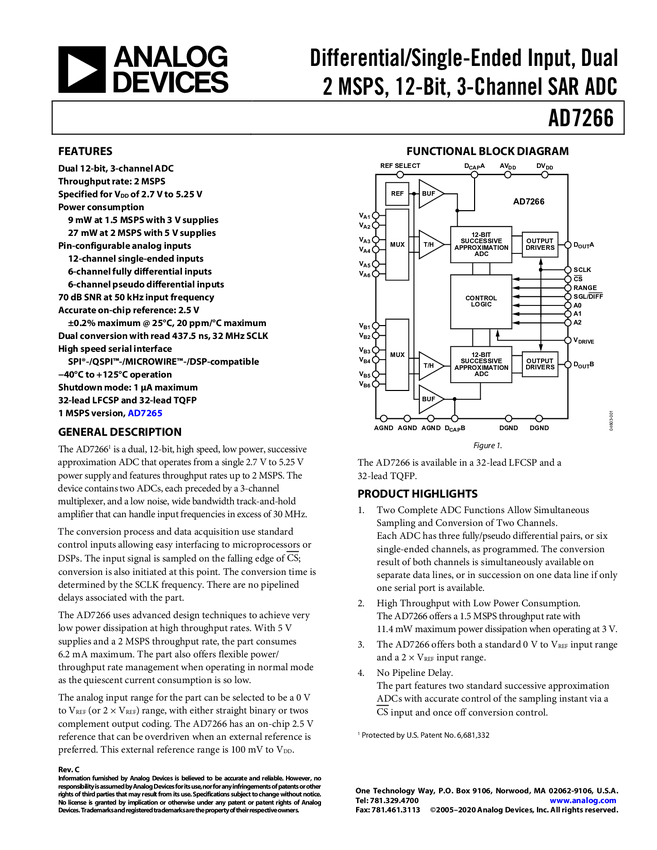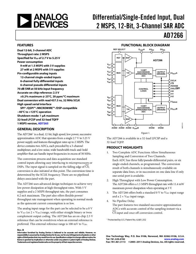 AD7266: Differential/Single-Ended Input, Dual, Simultaneous Sampling, 2 MSPS, 12-Bit, 3-Channel SAR A/D Converter