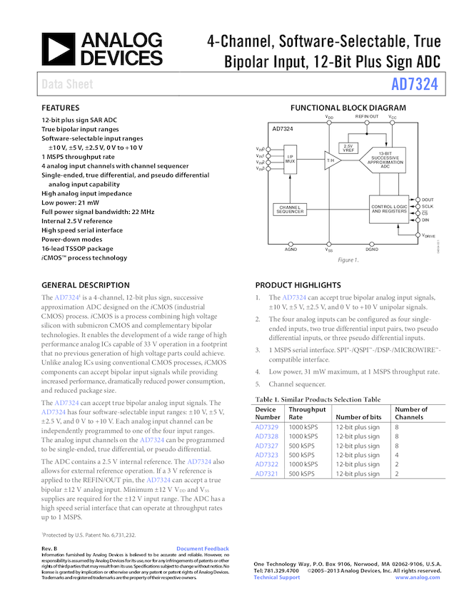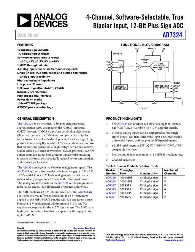AD7324: Software Selectable True Bipolar Input, 4-Channel, 12-Bit Plus Sign A/D Converter