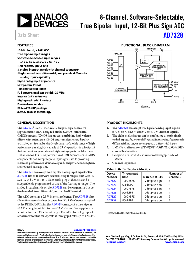 AD7328: Software Selectable, True Bipolar Input, 8-Channel, 12-Bit Plus Sign A/D Converter