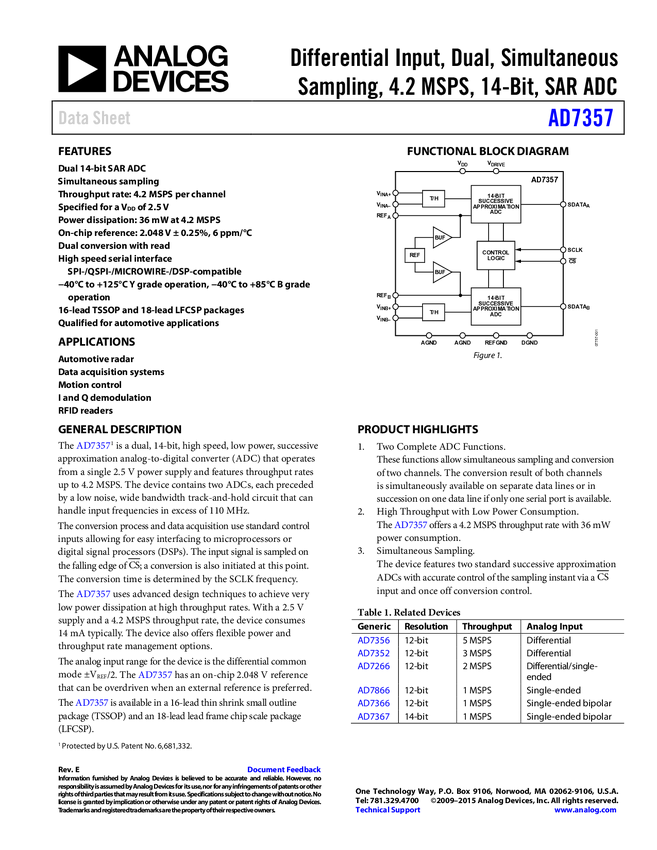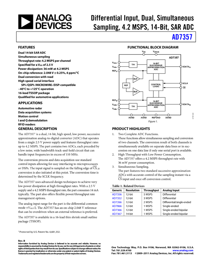 AD7357: Differential Input, Dual, Simultaneous Sampling, 4.25 MSPS, 14-Bit, SAR ADC