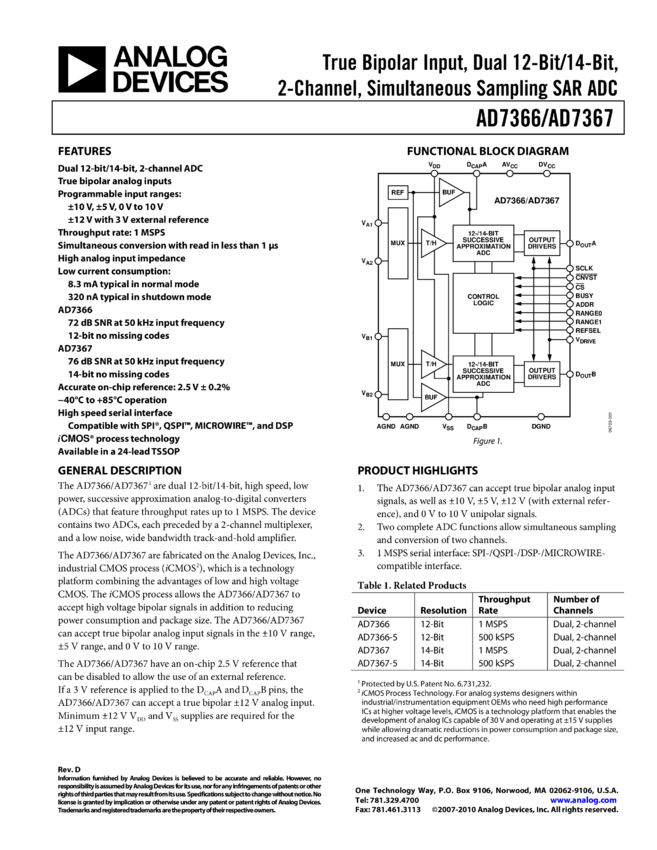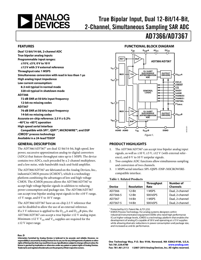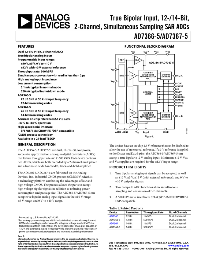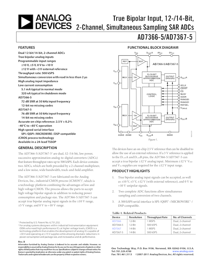 AD7367: True Bipolar Input, Dual 14-Bit, 2-Channel, Simultaneous Sampling SAR ADC