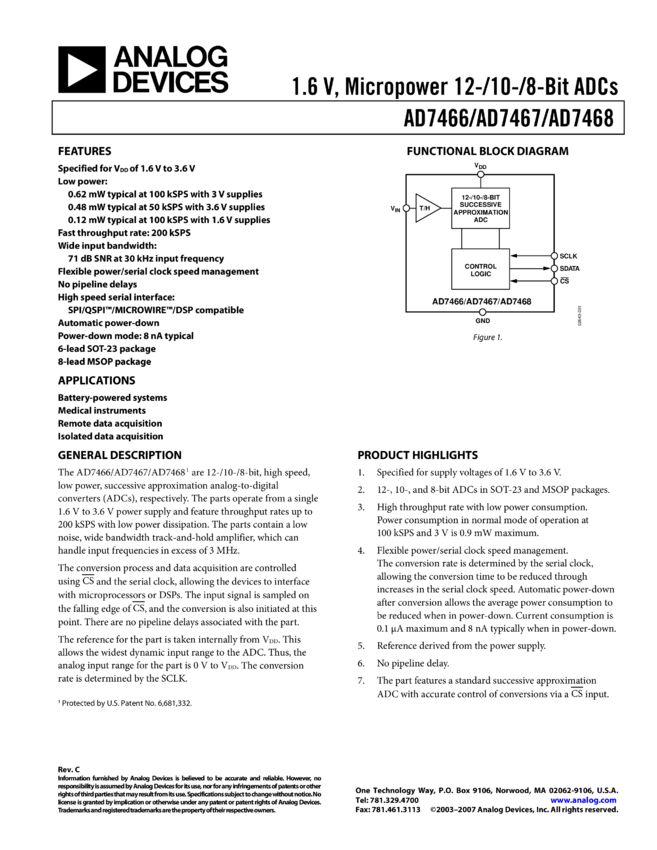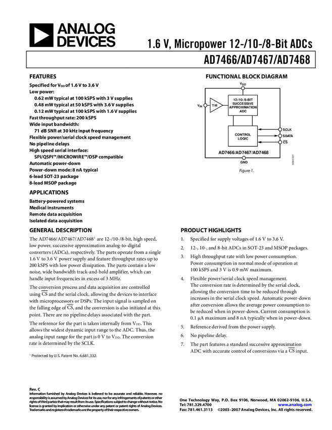 AD7468: 1.6 V Micro-Power 8-Bit ADC
