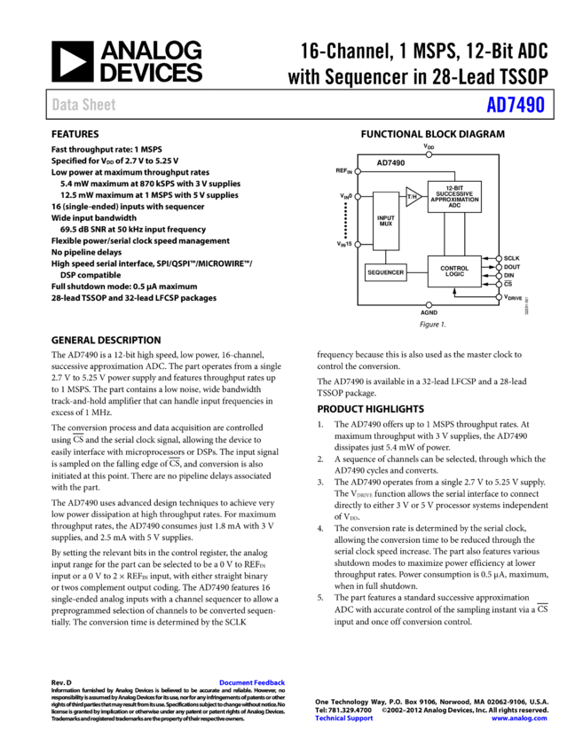 AD7490: 16-Channel, 1MSPS, 12-Bit ADC with Sequencer in 28-Lead TSSOP