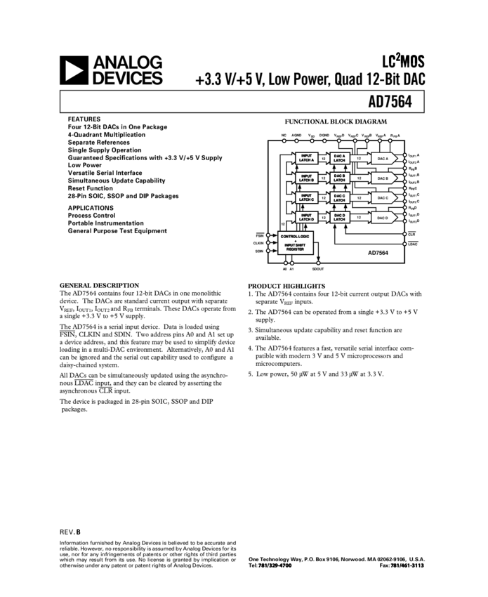 +3.3 V/+5 V, Low Power, Quad 12-Bit CMOS DAC