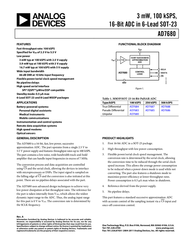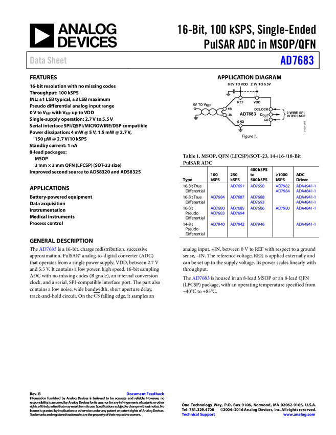 AD7686: 500 kSPS 16-BIT PulSAR® A/D Converter in MSOP/QFN