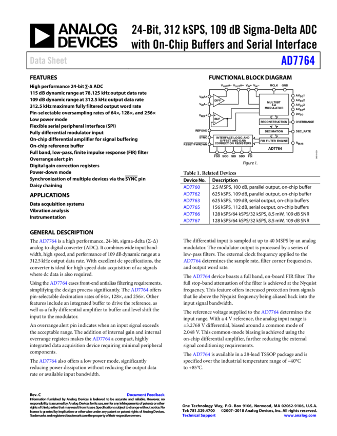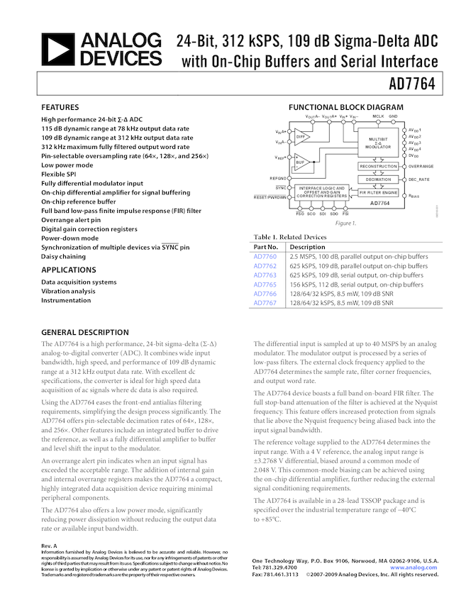 AD7764: 24-Bit, 312 kSPS, 109 dB Sigma Delta ADC with On-Chip Buffers and Serial Interface