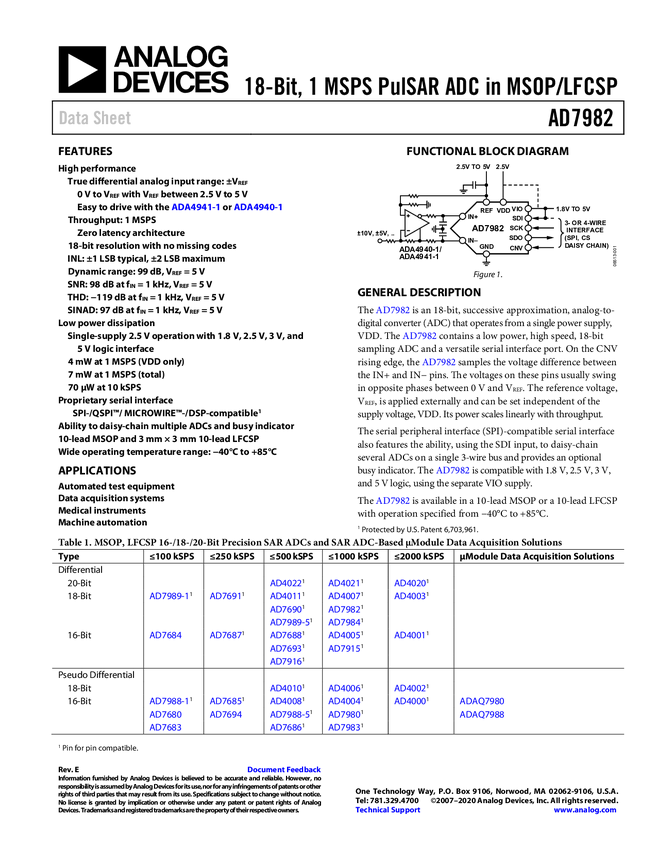 AD7982: 18-Bit, 1 MSPS PulSAR® 7.0 mW ADC in MSOP/QFN
