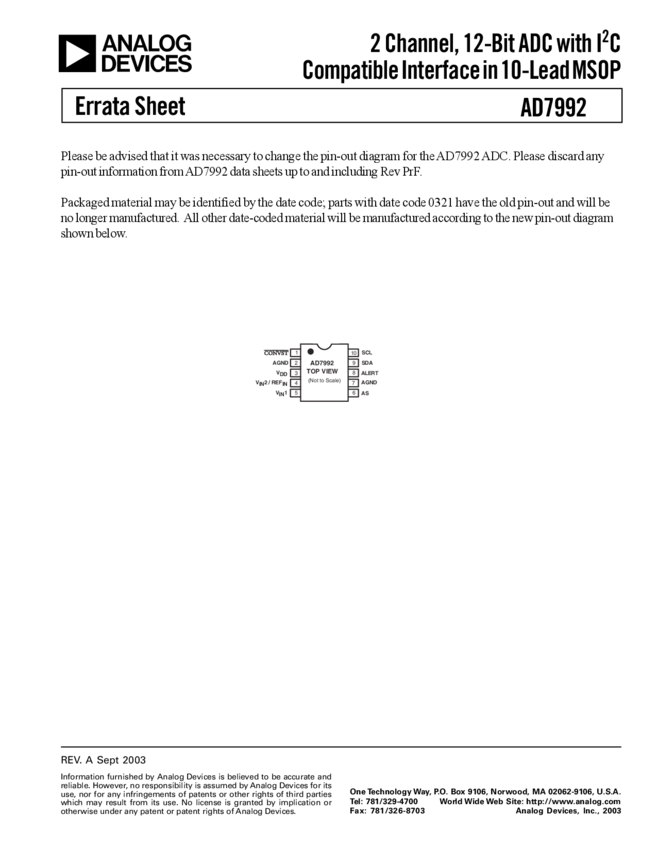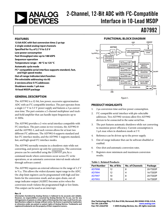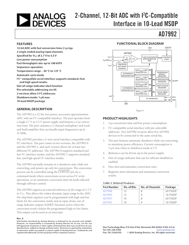 AD7992: 2-Channel, 12-Bit ADC with IC Compatible Interface in 10-Lead MSOP