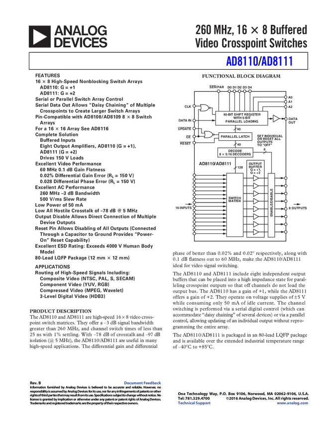260 MHz, 16 x 8 Buffered Video Crosspoint Switch (Gain=1)