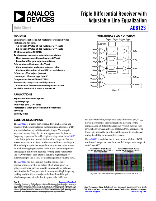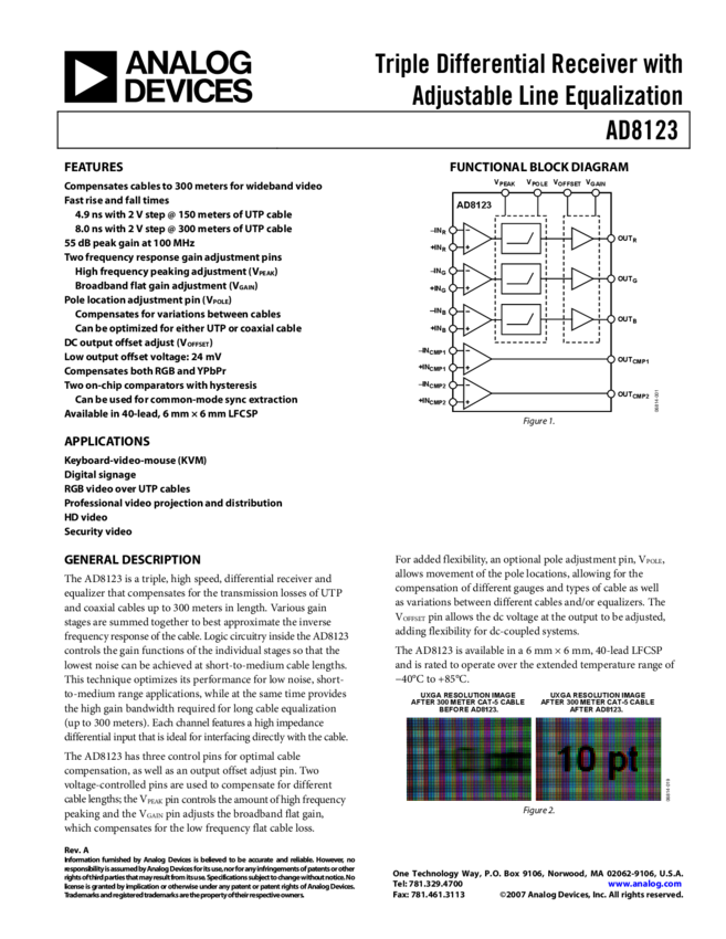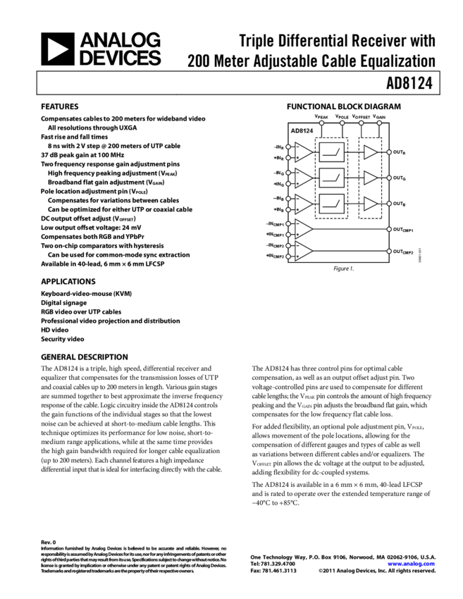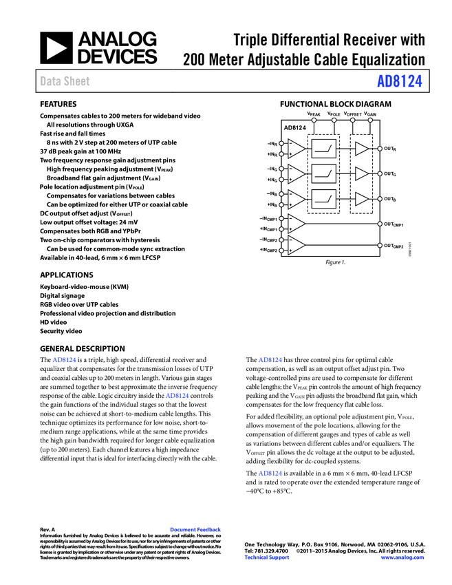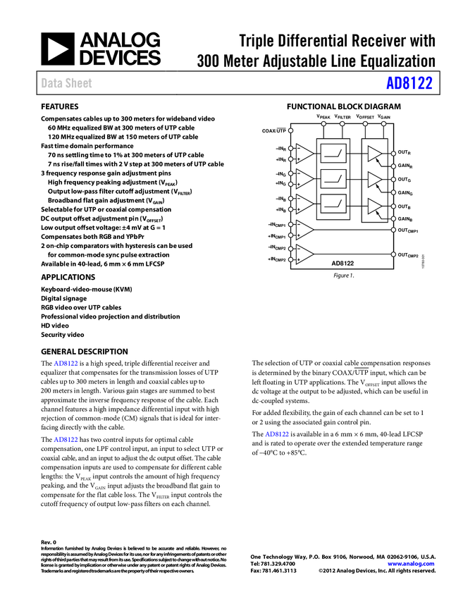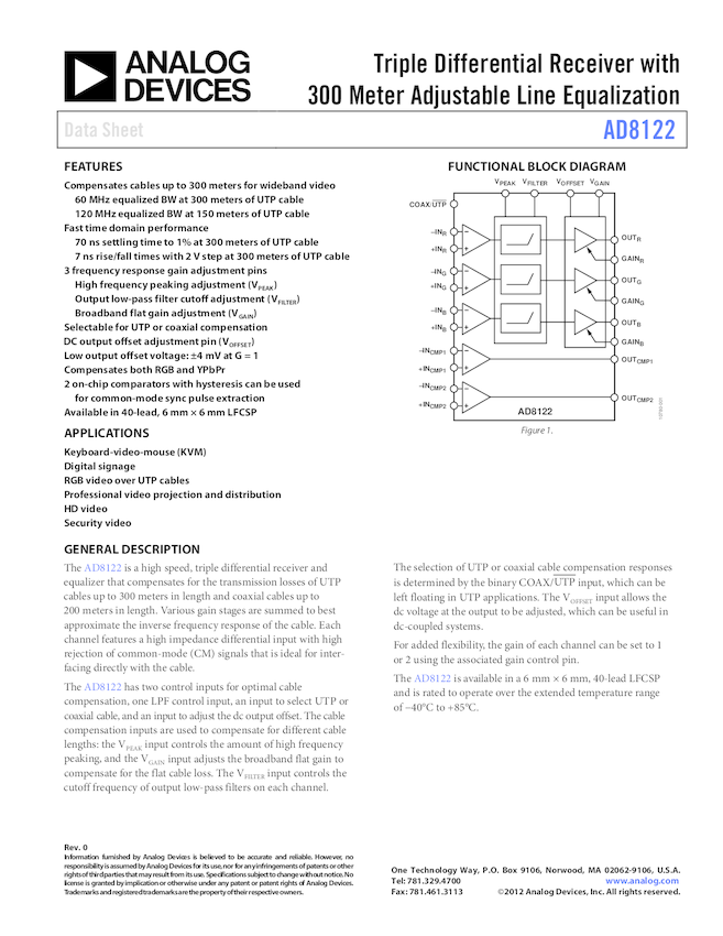 AD8122: Triple Differential Receiver with 300m Adjustable Cable Equalization