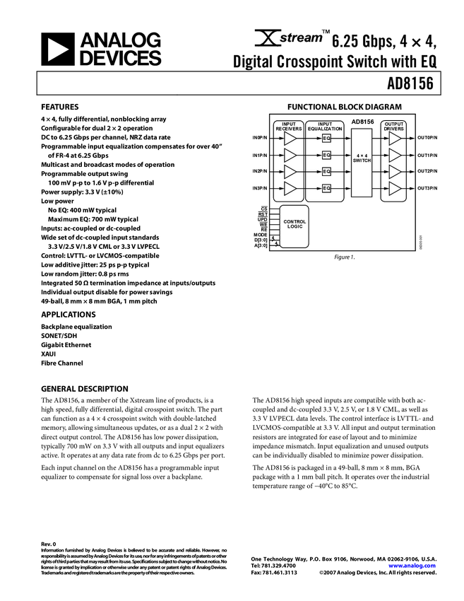 6.25 G, 4 × 4, Digital Crosspoint Switch with EQ