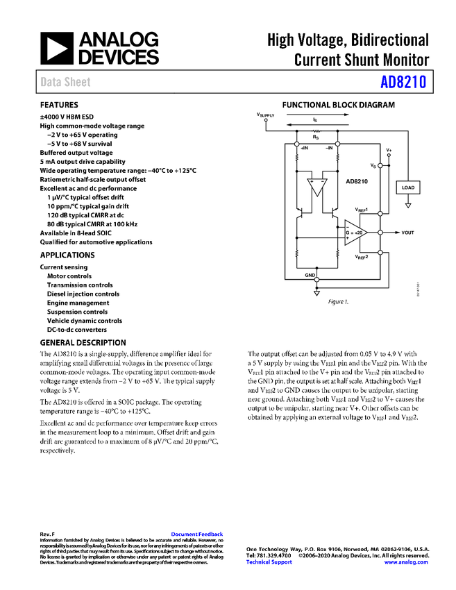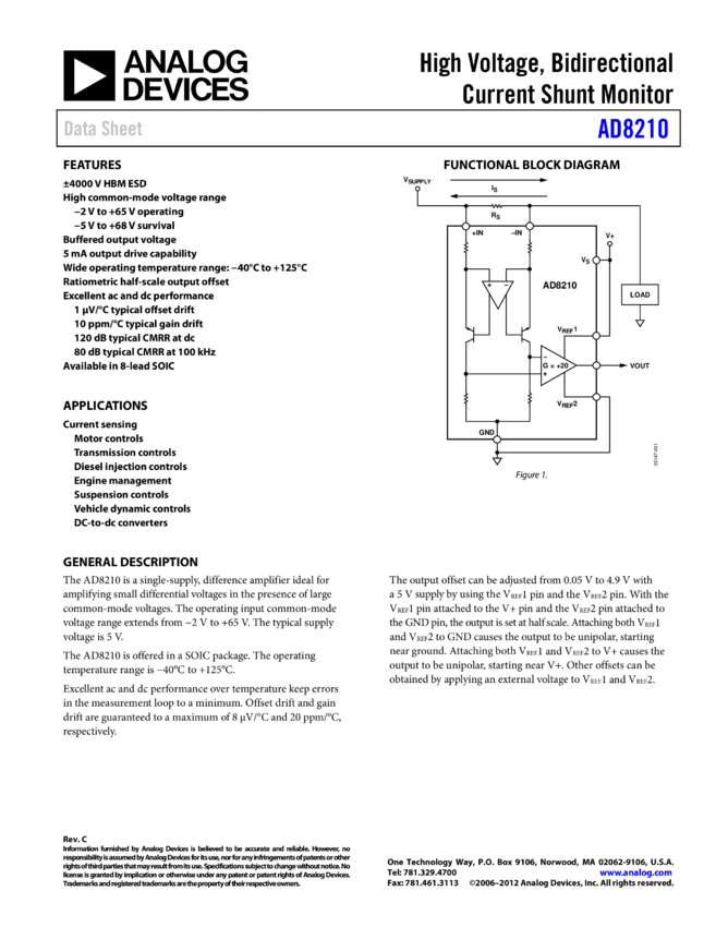 AD8210: High Voltage, Bidirectional Current Shunt Monitor