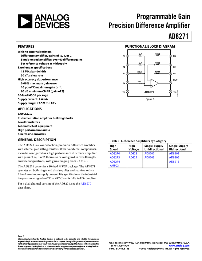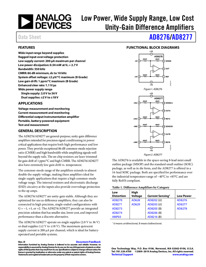 Low Power, Wide Supply Range, Low Cost Unity-Gain Difference Amplifier