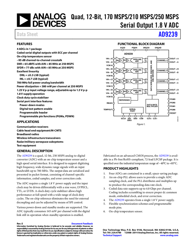 Quad, 12-Bit, 170 MSPS/210 MSPS/250 MSPS Serial Output 1.8 V ADC