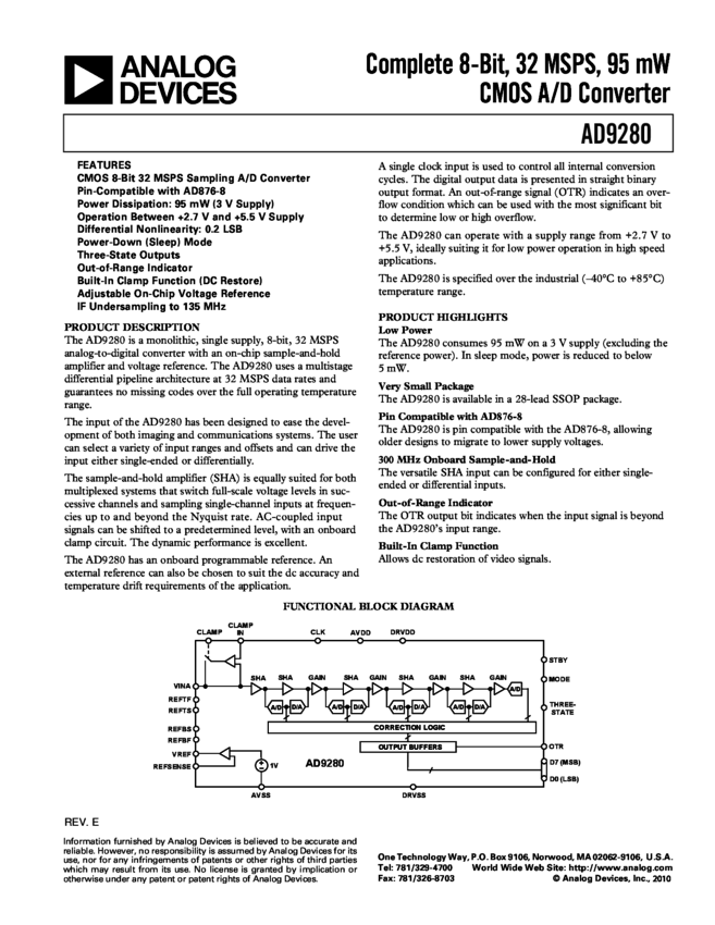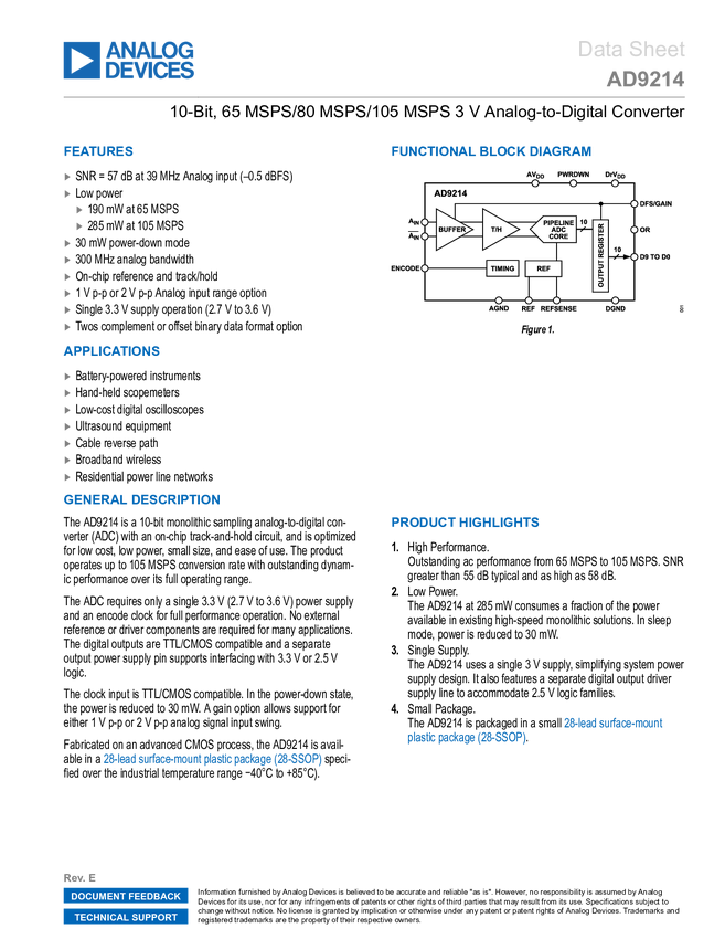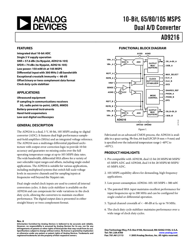 10-Bit, 65 MSPS/80 MSPS/105 MSPS 3 V Analog-to-Digital Converter