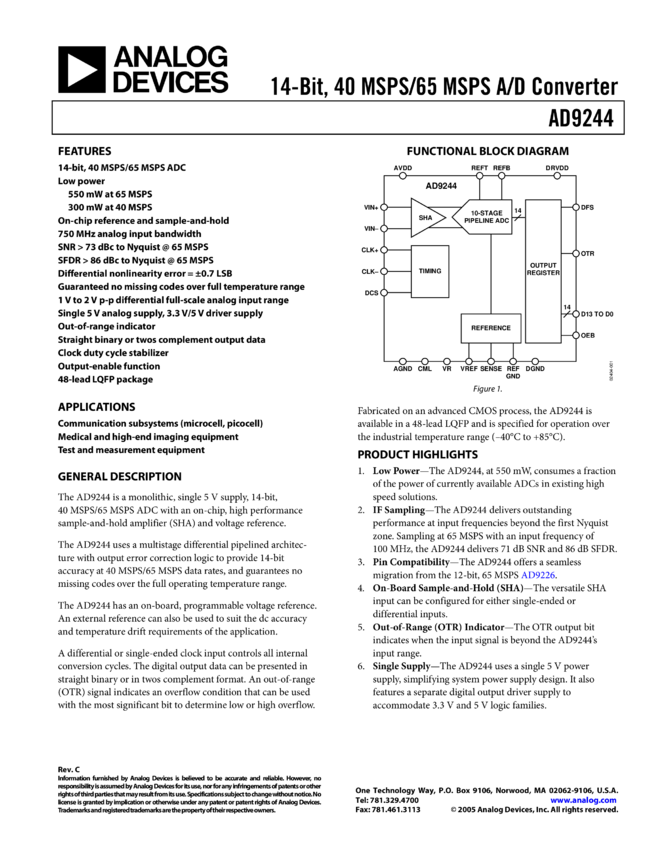 AD9244: 14-Bit 40/65 MSPS IF Sampling Analog-To-Digital Converter