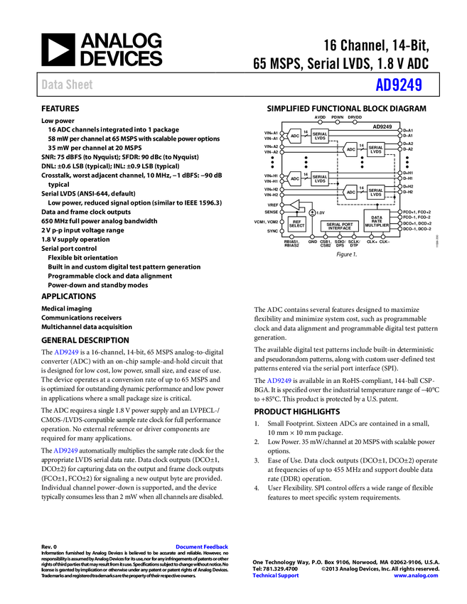 16 Channel 14-Bit, 65 MSPS, Serial LVDS, 1.8 V A/D Converter