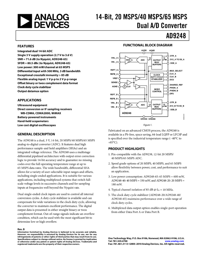 AD9248: Dual 14-Bit, 20/40/65 MSPS, 3 V Analog-to-Digital Converter