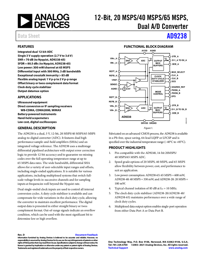 AD9238: Dual 12-Bit, 20/40/65 MSPS, 3 V ADC