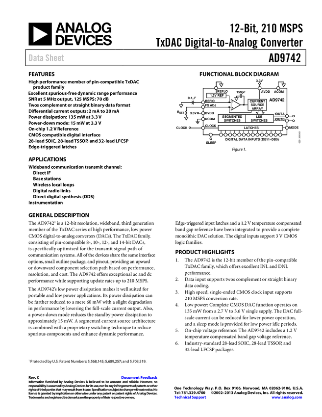 AD9742: 12-Bit, 210 MSPS D/A Converter