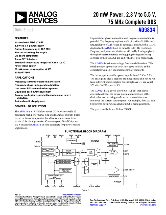 AD9834: 20 W Power, 2.3 V to 5.5 V, 75 MH Complete DDS