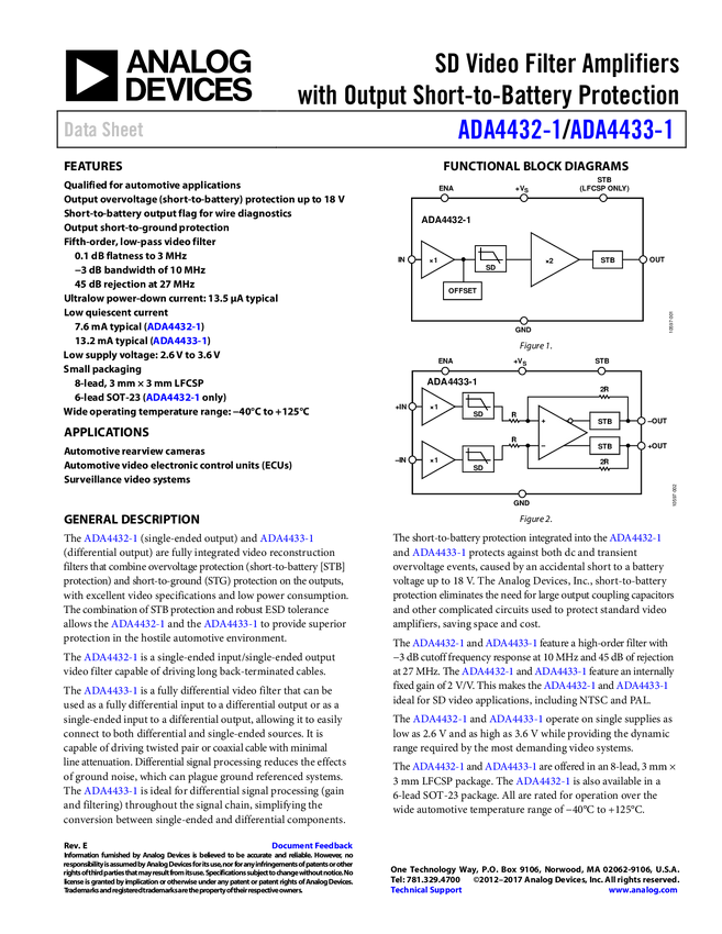 ADA4433-1: Fully Differential SD Video Filter Amplifier with Output Short-to-Battery Protection