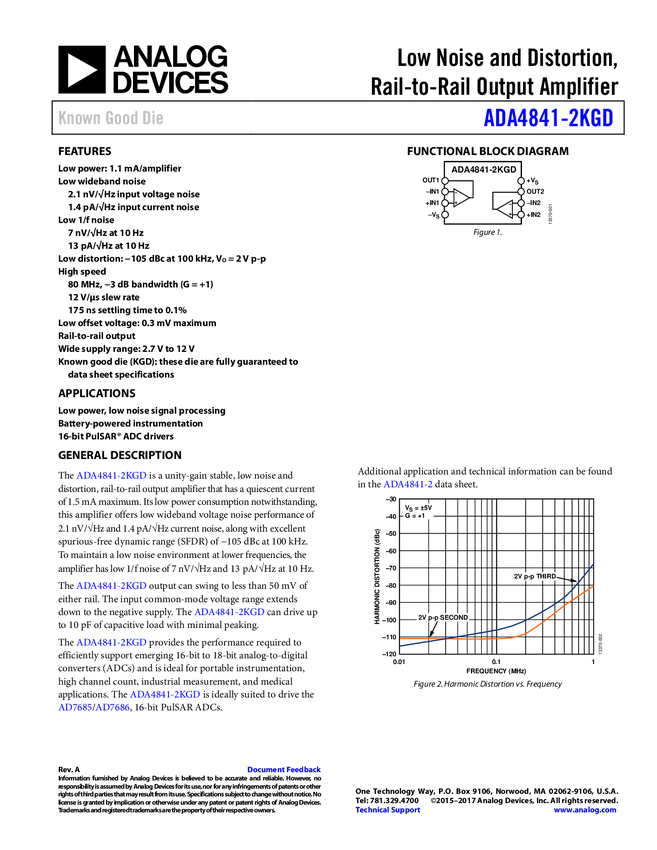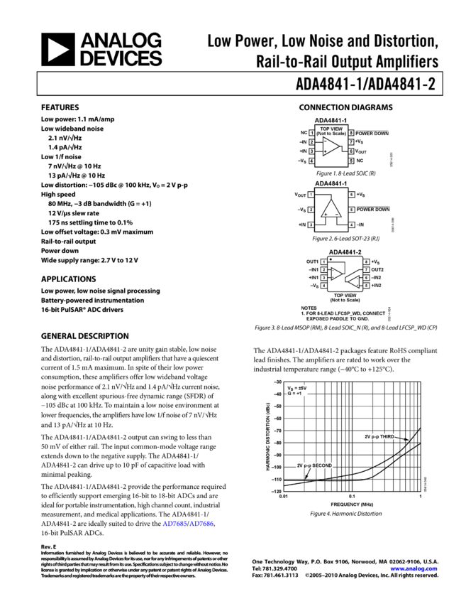 ADA4841-1: Low Power, Low Noise and Distortion, Rail-to-Rail Output Amplifier