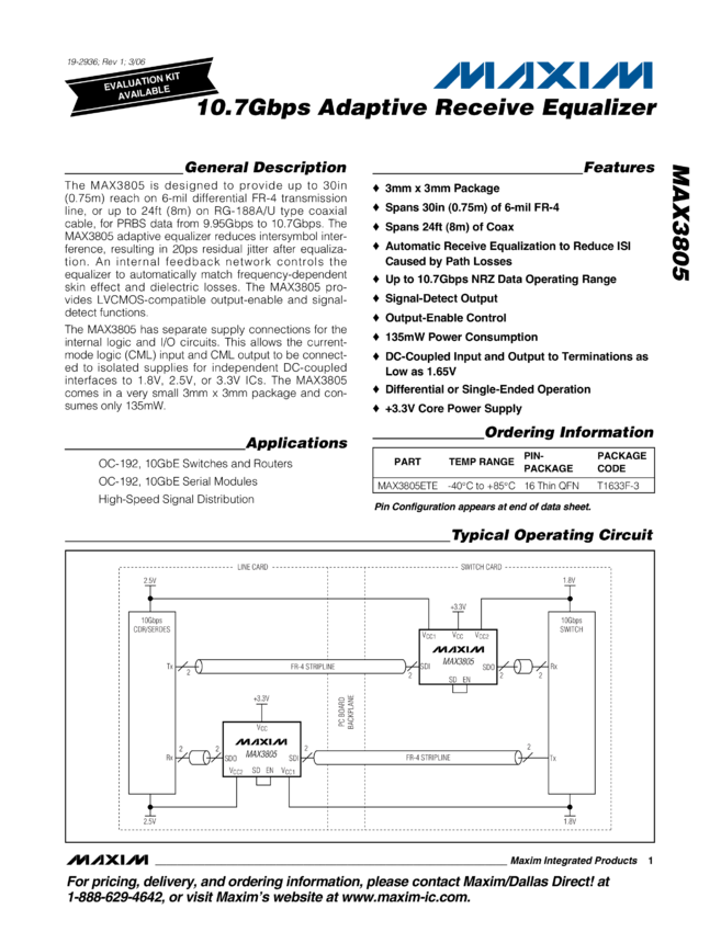 MAX3805 10.7Gbps Adaptive Receive Equalizer