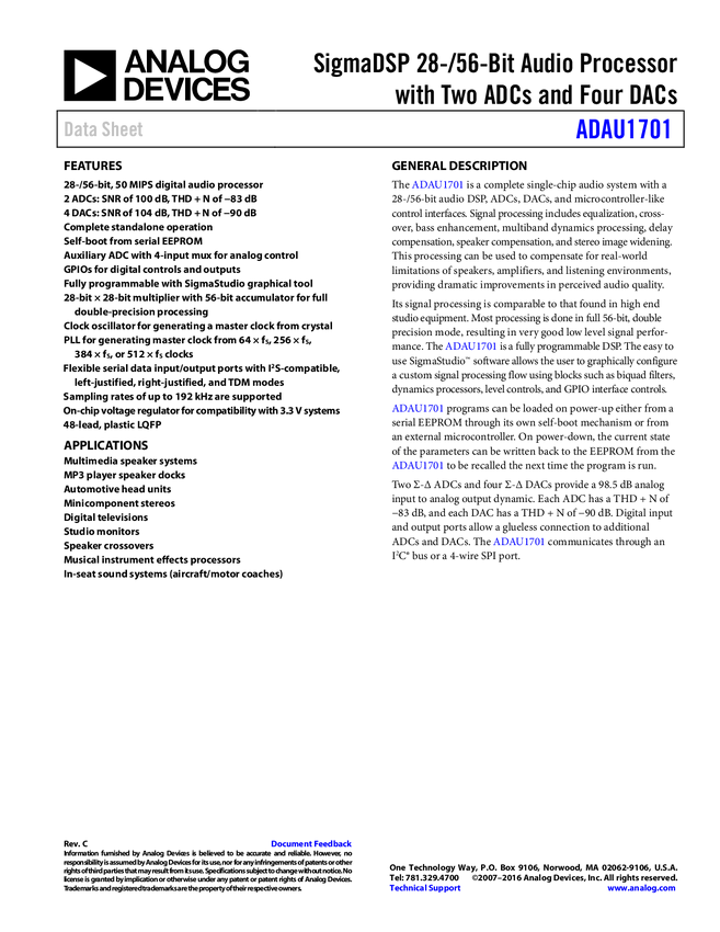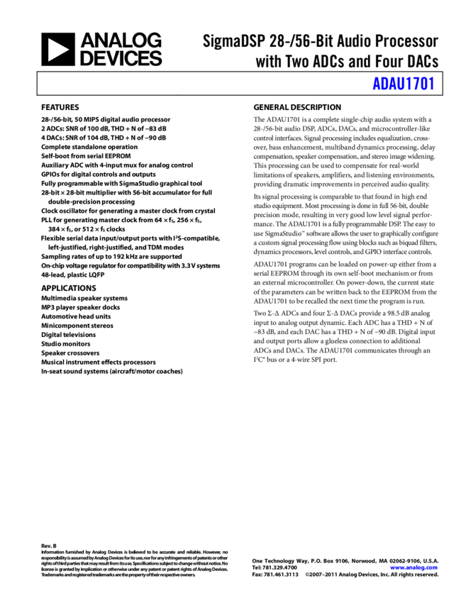 ADAU1701: SigmaDSP® 28/56-Bit Audio Processor with Two ADCs and Four DACs
