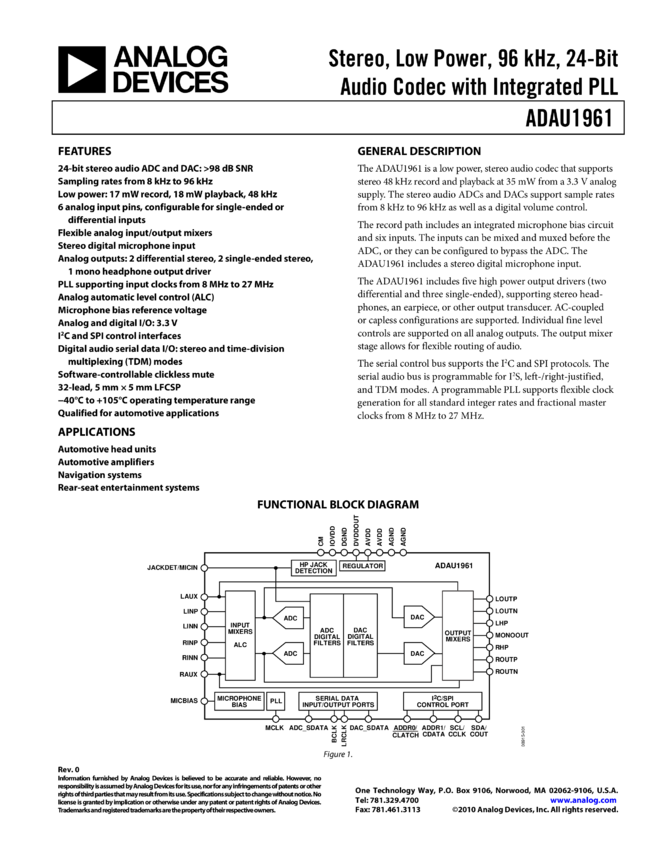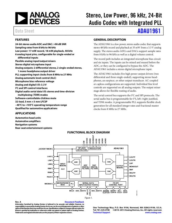 ADAU1961: Automotive Stereo, Low Power, 96 kHz, 24-Bit Audio Codec with Integrated PLL