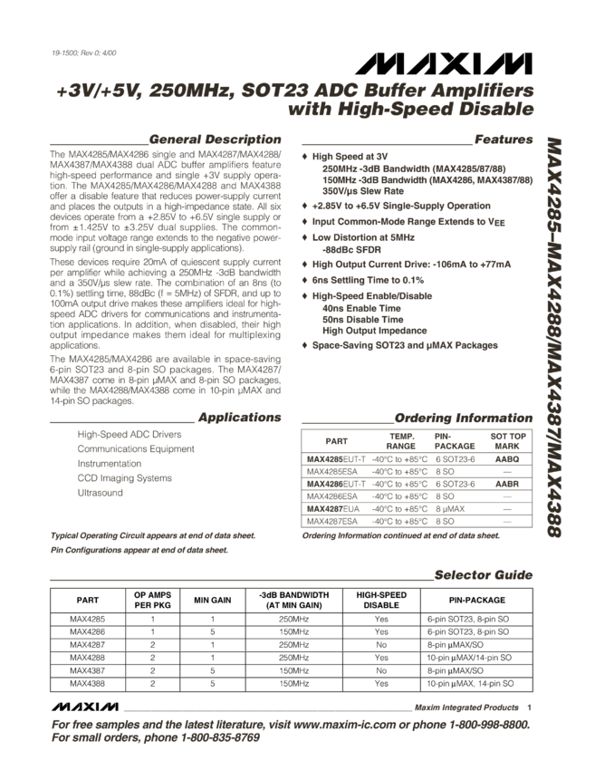 MAX4285, MAX4286, MAX4287, MAX4288, MAX4387, MAX4388 +3V/+5V, 250MHz, SOT23 ADC Buffer Amplifiers with High-Speed Disable