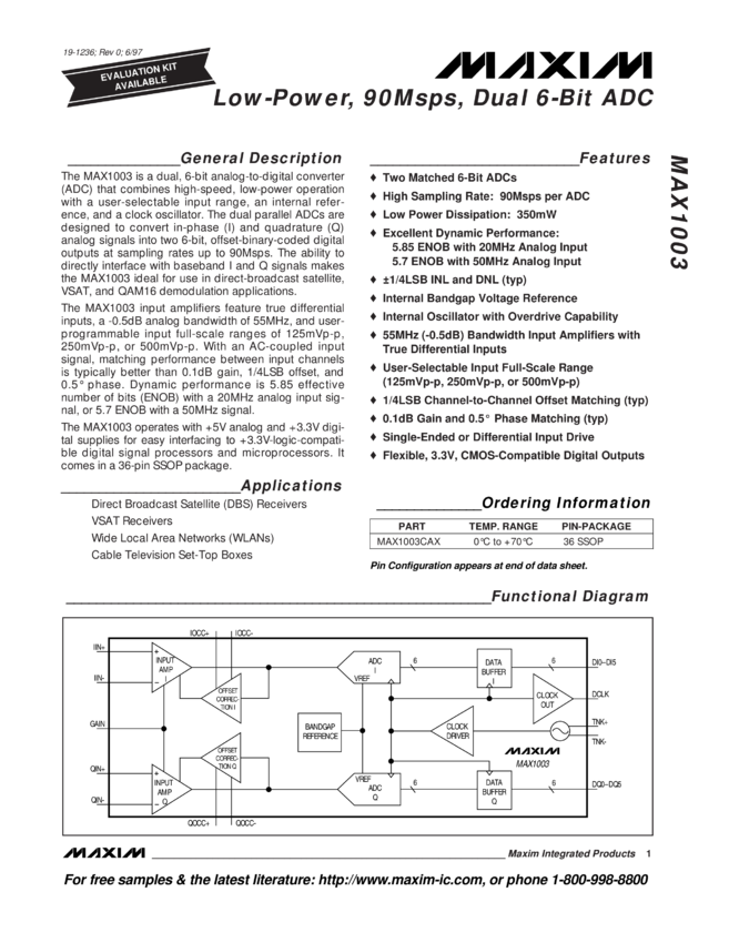 MAX1003 Low-Power, 90Msps, Dual 6-Bit ADC