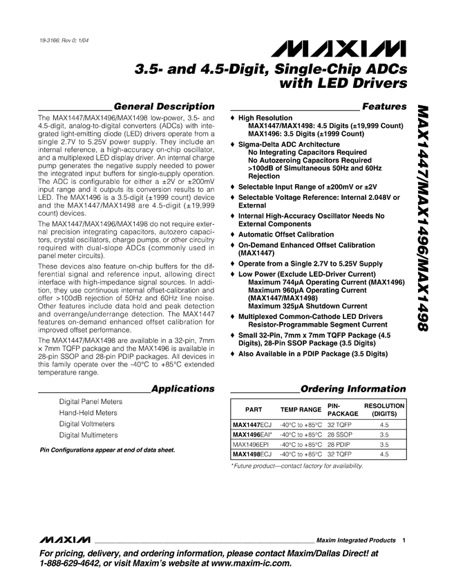 MAX1447, MAX1496, MAX1498 3.5- and 4.5-Digit, Single-Chip ADCs with LED Drivers