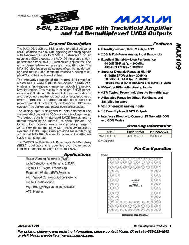 MAX109 8-Bit, 2.2Gsps ADC with Track/Hold Amplifier and 1:4 Demultiplexed LVDS Outputs