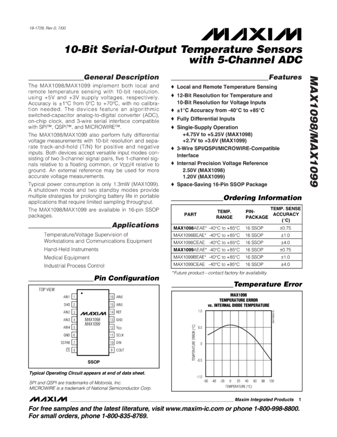 MAX1098, MAX1098A, MAX1098B, MAX1098C, MAX1099, MAX1099A, MAX1099B, MAX1099C 10-Bit Serial-Output Temperature Sensor with 5-Channel ADC