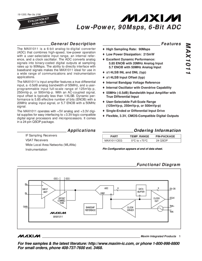 MAX1011 Low-Power, 90Msps, 6-Bit ADC
