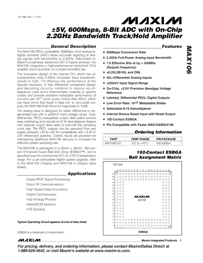 MAX106 ±5V, 600Msps, 8-Bit ADC with On-Chip 2.2GHz Bandwidth Track/Hold Amplifier