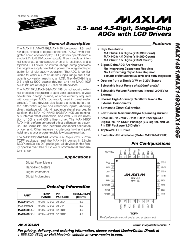 MAX1491, MAX1493, MAX1495 3.5- and 4.5-Digit, Single-Chip ADCs with LCD Drivers