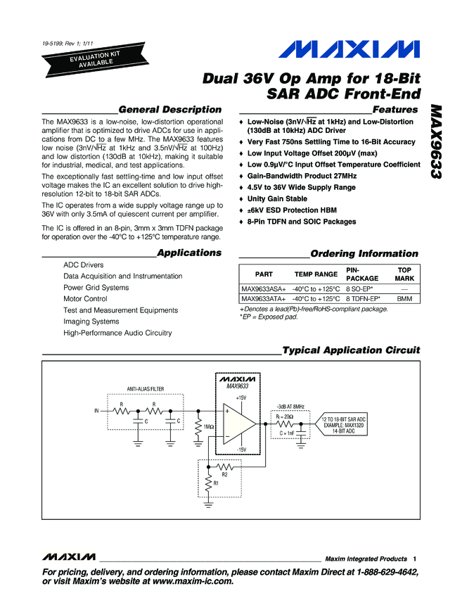 MAX9633 Dual 36V Op Amp for 18-Bit SAR ADC Front-End