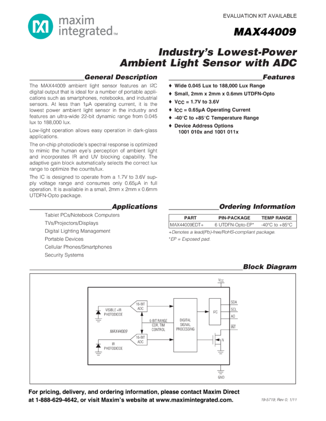 MAX44009 Industry's Lowest-Power Ambient Light Sensor with ADC