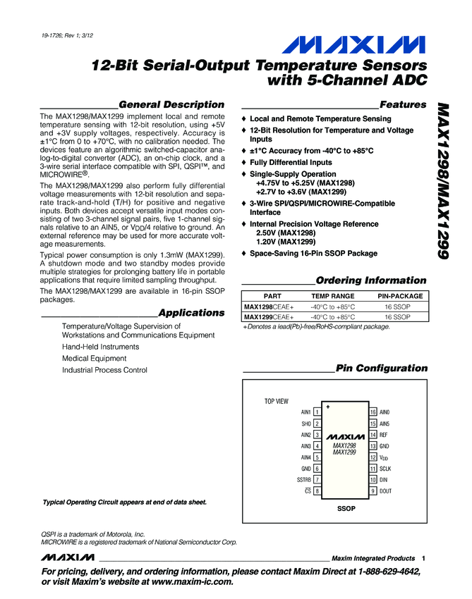 MAX1298, MAX1298A, MAX1298B, MAX1298C, MAX1299, MAX1299A, MAX1299B, MAX1299C 12-Bit Serial-Output Temperature Sensors with 5-Channel ADC