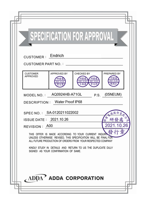 Wentylator osiowy ADDA AQ0924HB-A71GL(05NEUM), 24 V/DC, (D x S x W) 92.5 x 92.5 x 25 mm