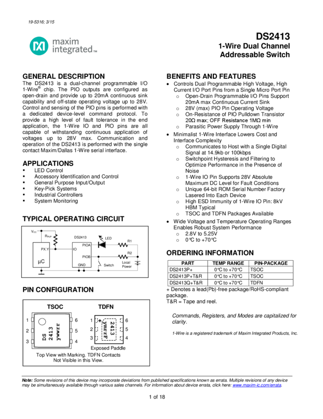 DS2413 1-Wire Dual Channel Addressable Switch