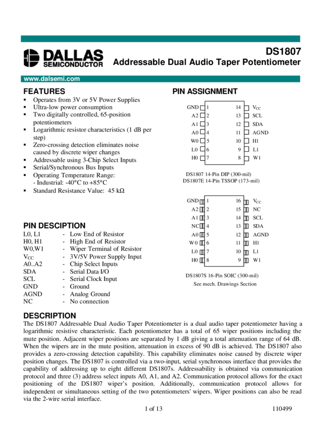 DS1807 Addressable Dual Audio Taper Potentiometer