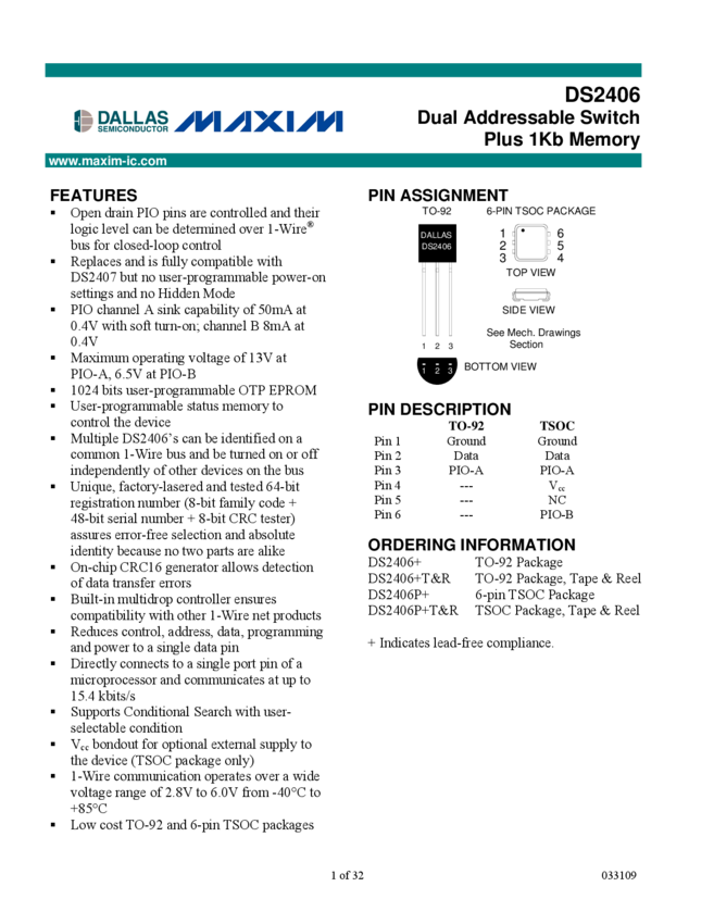 DS2406 1-Wire Dual Addressable Switch Plus 1Kb Memory