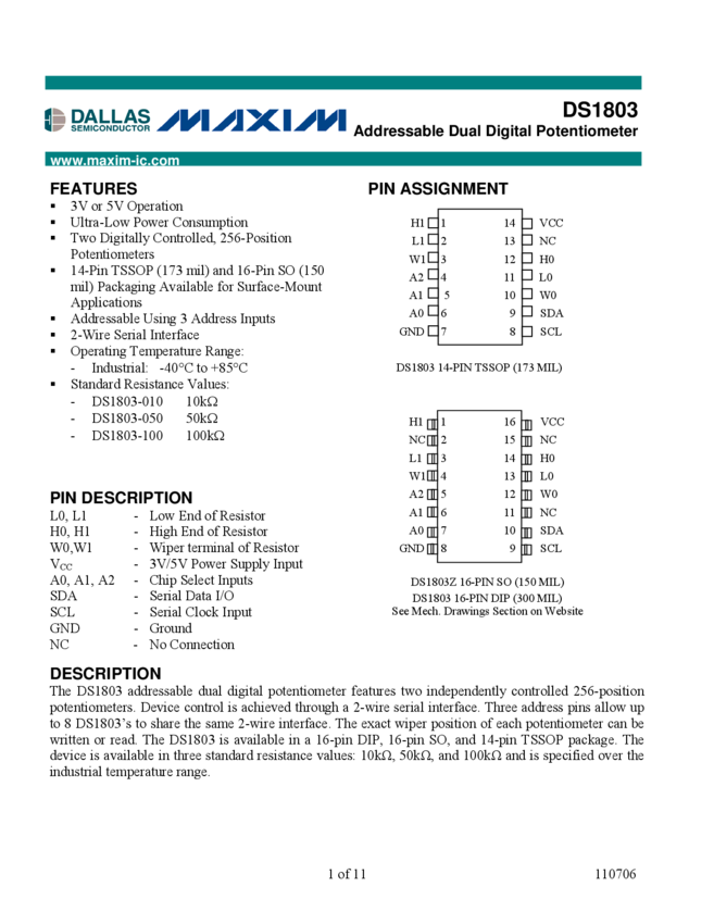 DS1803 Addressable Dual Digital Potentiometer