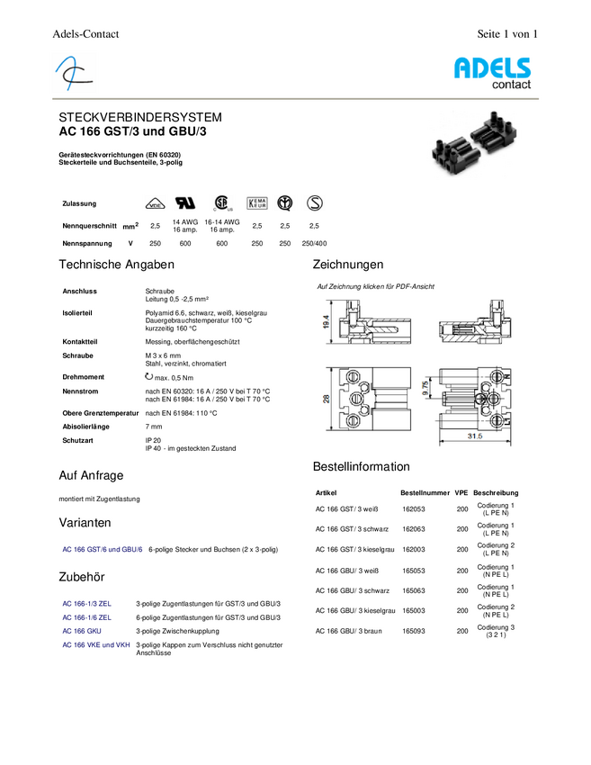 Złącze męskie sieciowe Adels-Contact złącze męskie kątowe Łączna ilość styków: 2 + PE 16 A biały AC 166 GST/ 3 1 szt.