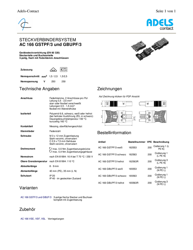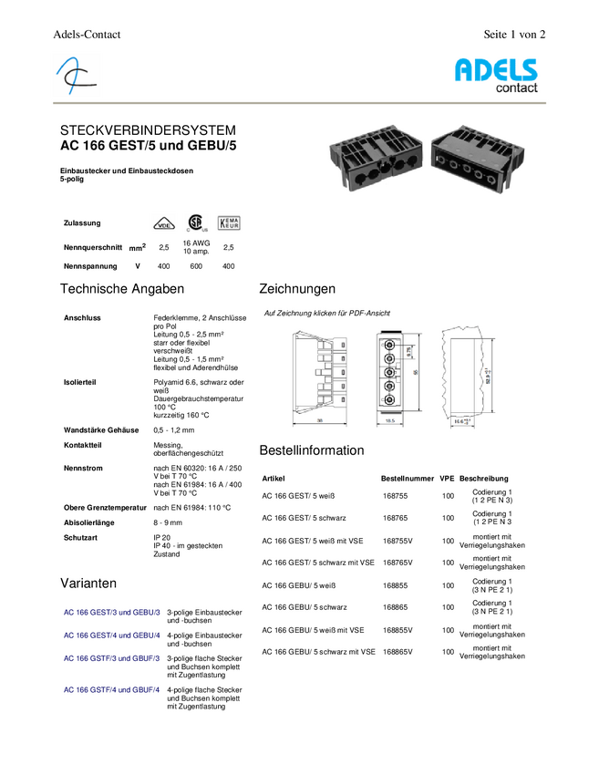 Złącze męskie sieciowe Adels-Contact złącze żeńskie proste Łączna ilość styków: 2 + PE 16 A czarny AC 166 GBUPF/ 3 1 szt