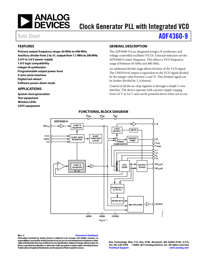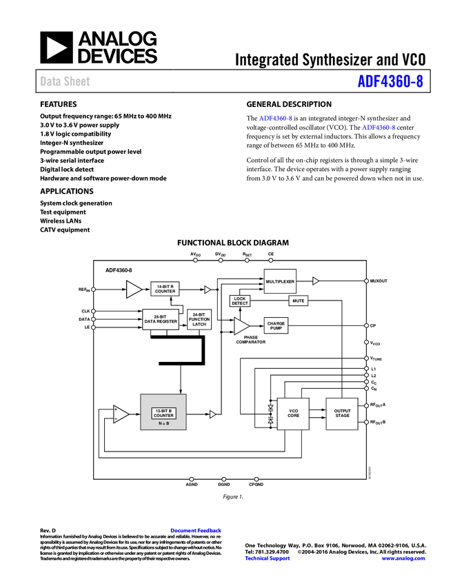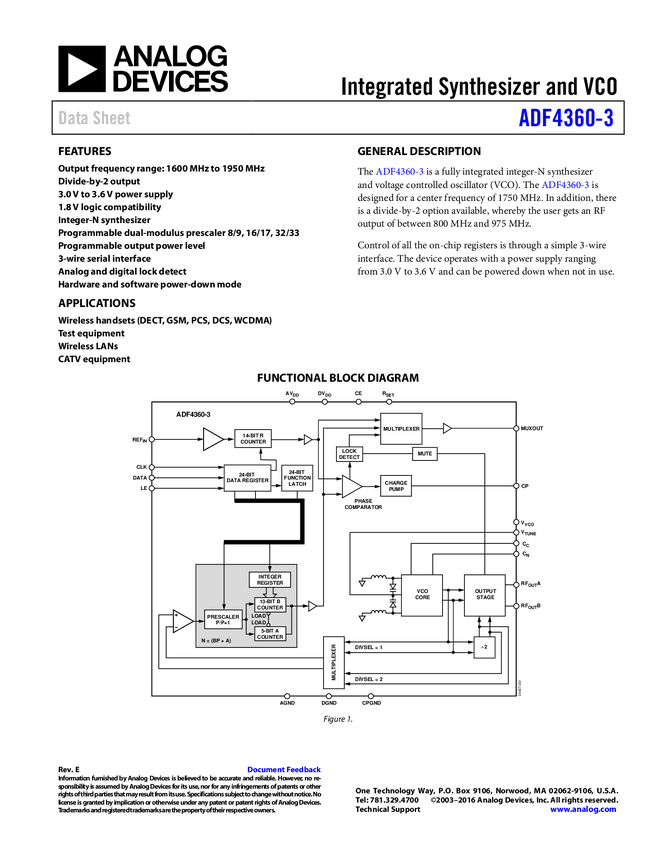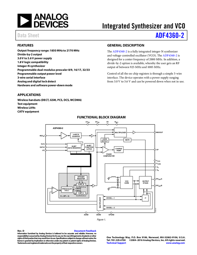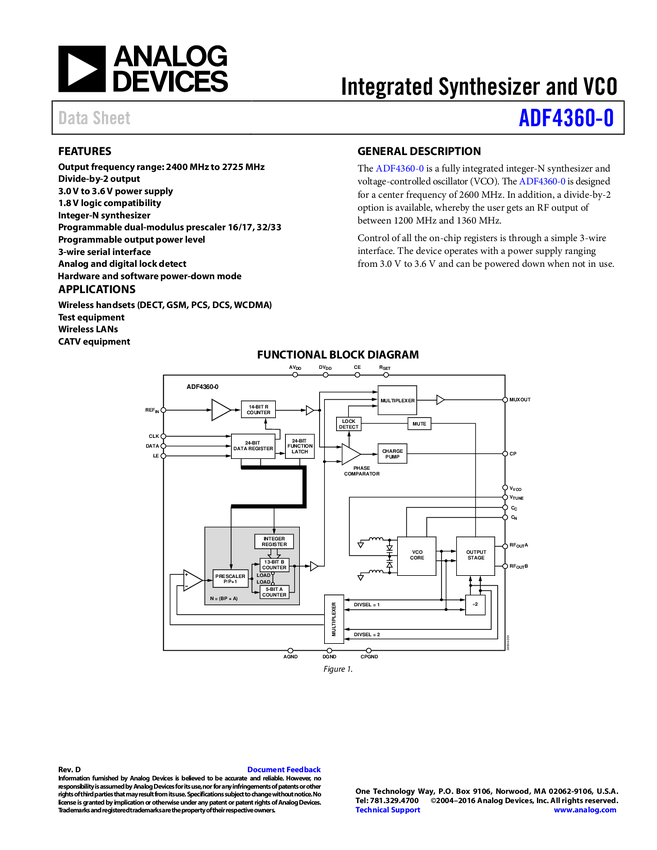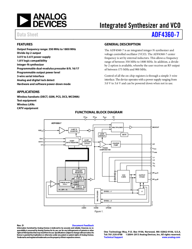 ADF4360-7: Integrated Integer-N Synthesizer and VCO - Output Frequency 350 to 1800