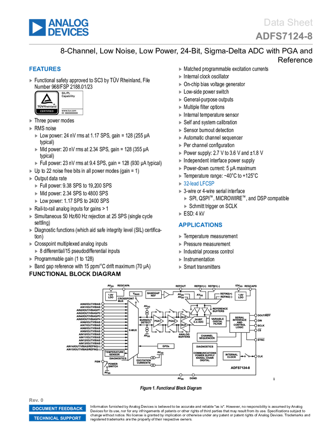 8-Channel, Low Noise, Low Power, 24-Bit, Sigma-Delta ADC with PGA and Reference